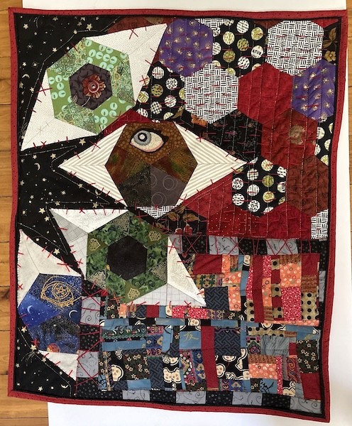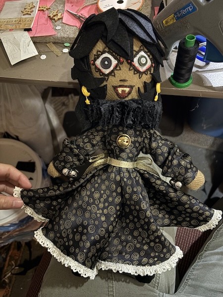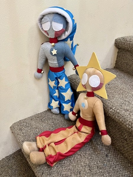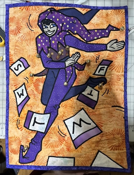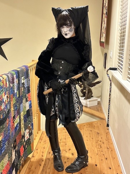 Jester Costume fully self-designed, patterned, and sewn. Features a matching Marrotte with a Ceramic Head.