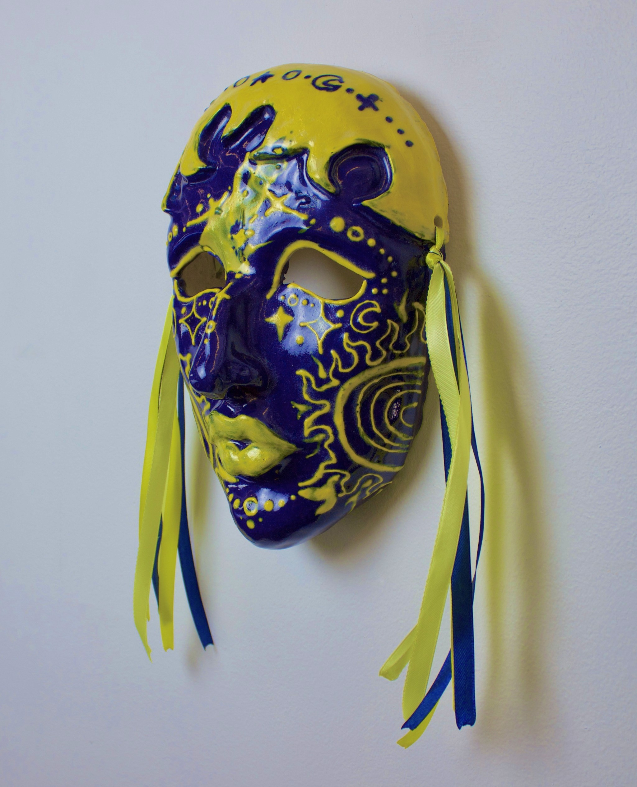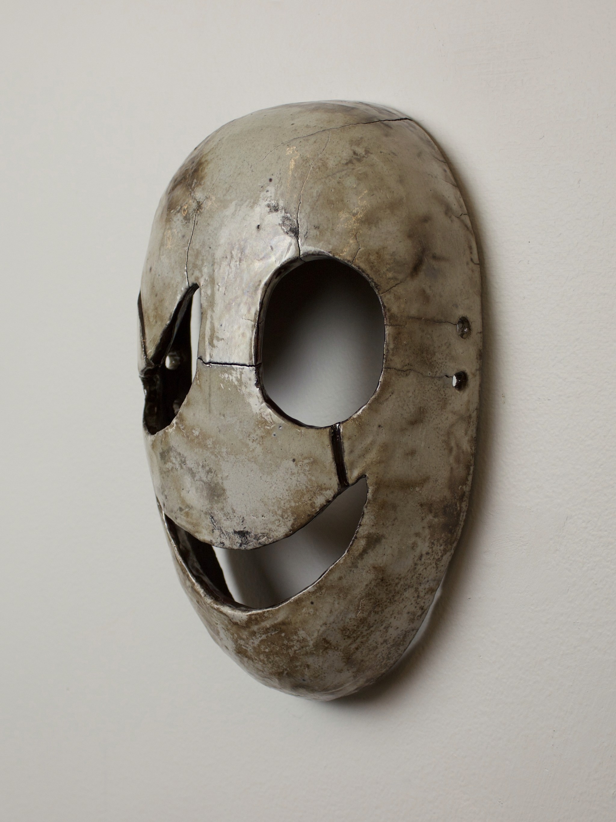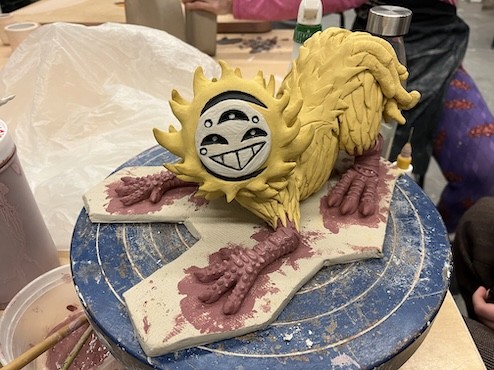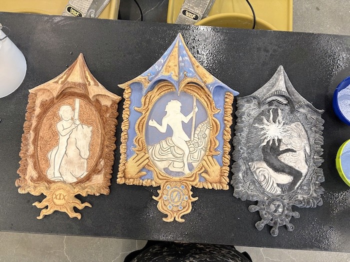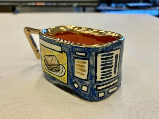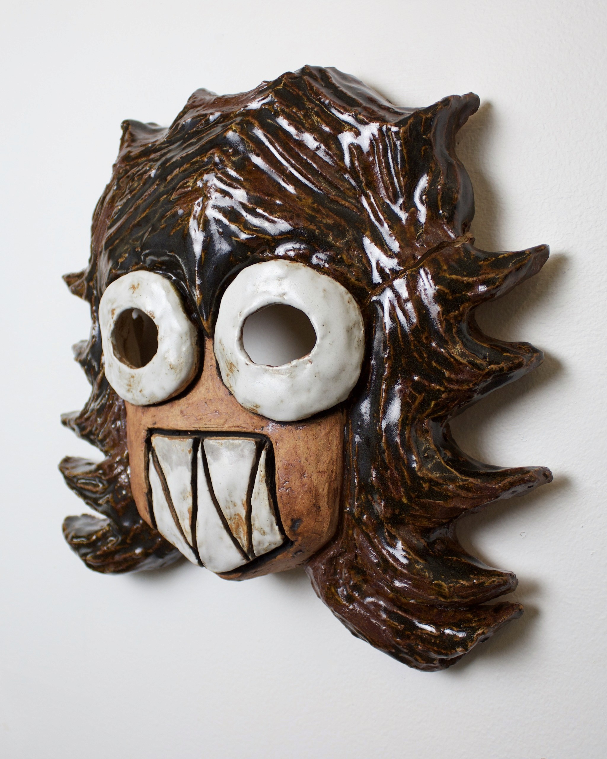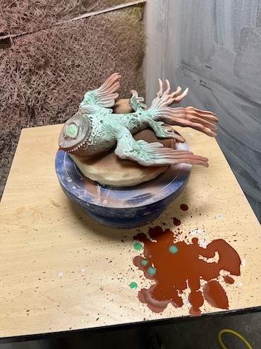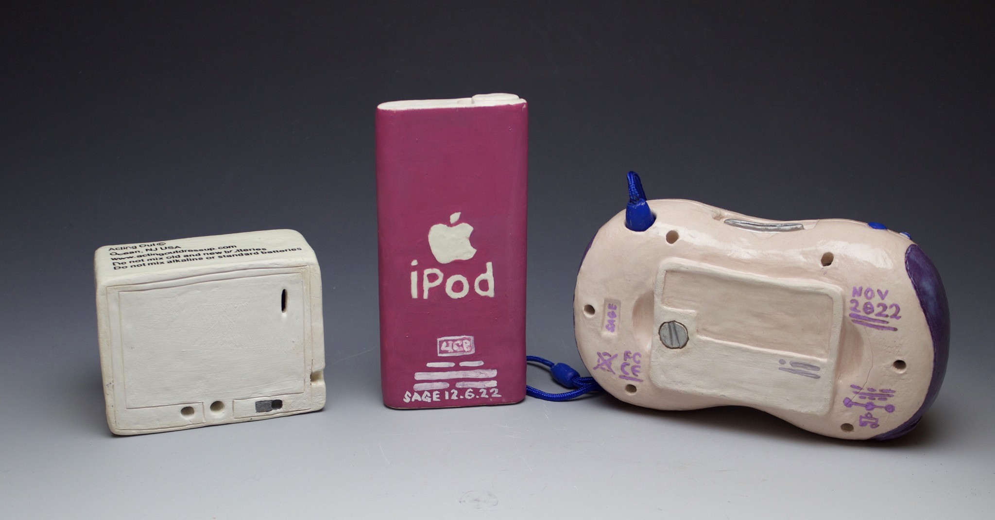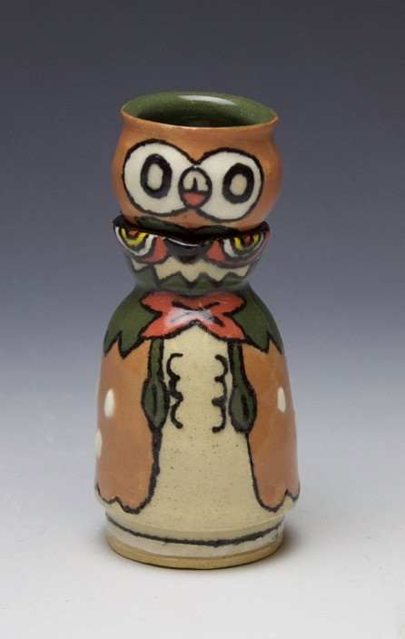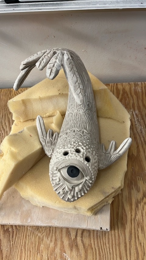 Hand-built porcelain with slip, overglaze, and glaze accents. Epoxy, paint and lacquer detailing added post fire. Iridescent Vinyl added post fire.