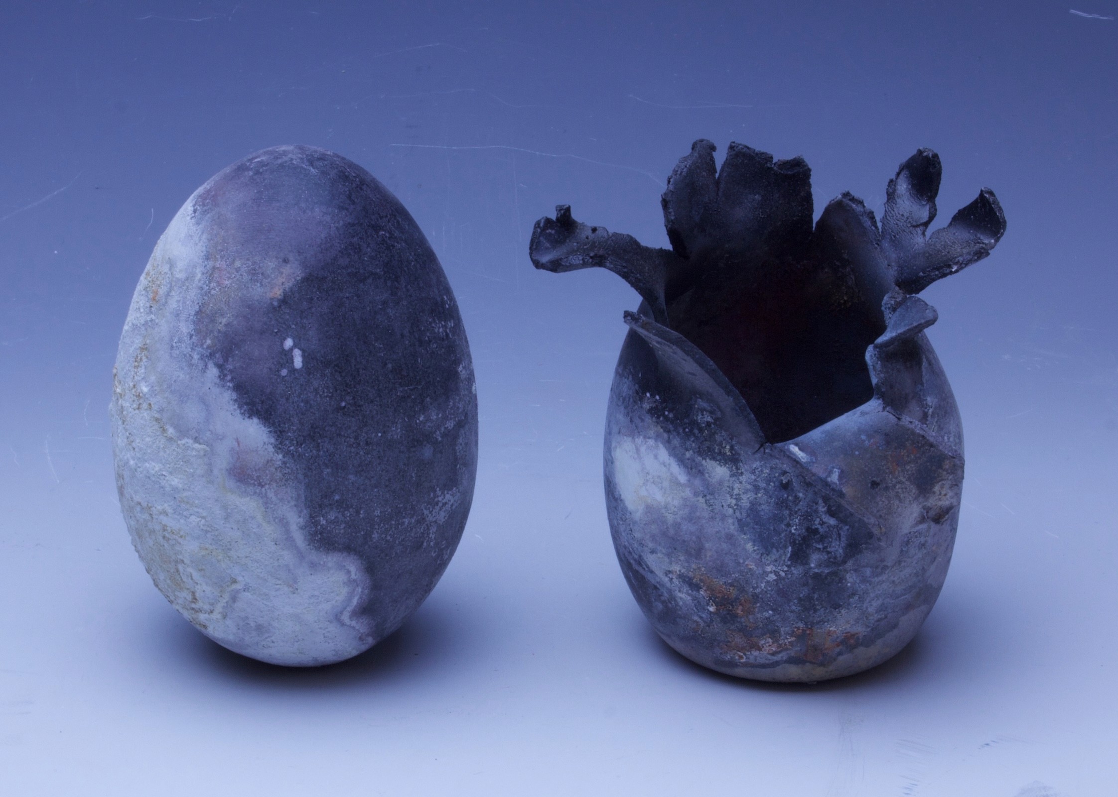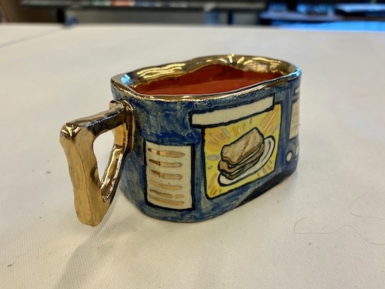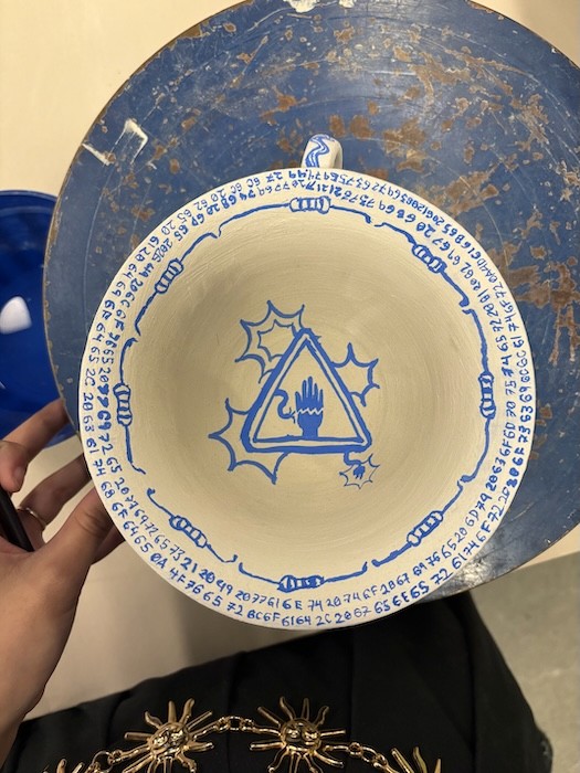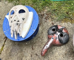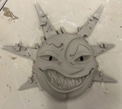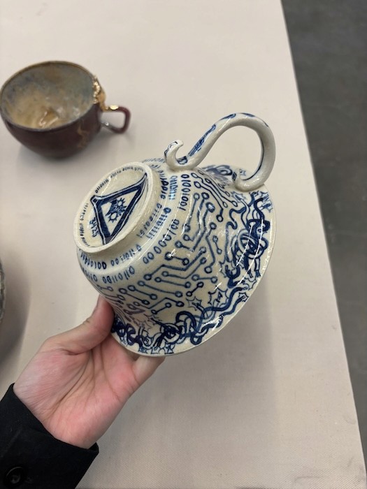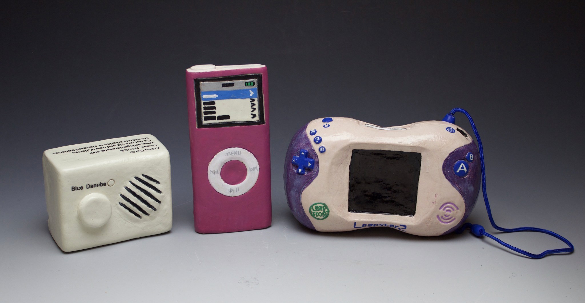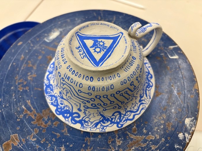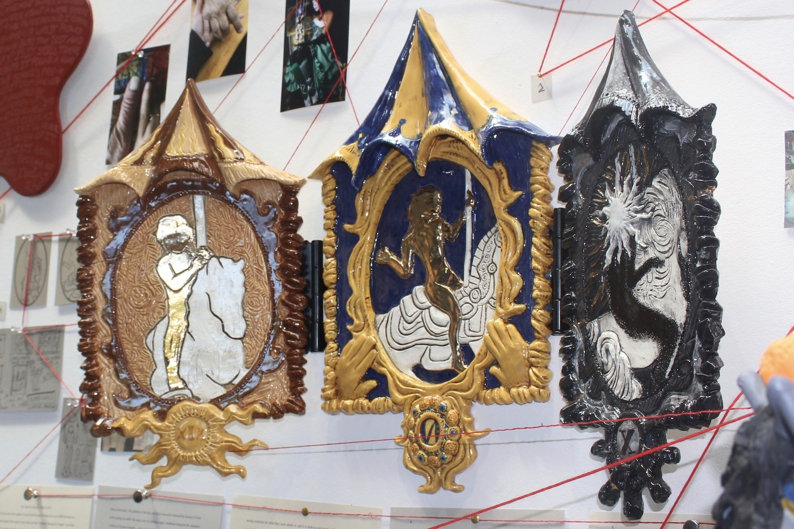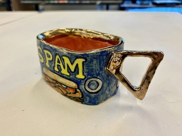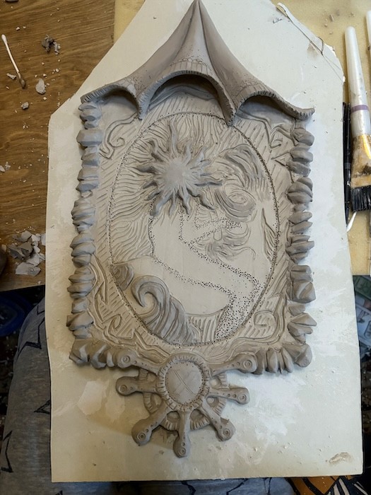 Hand-built porcelain with slip, overglaze, and glaze accents. Epoxy, paint and lacquer detailing added post fire. Iridescent Vinyl added post fire.