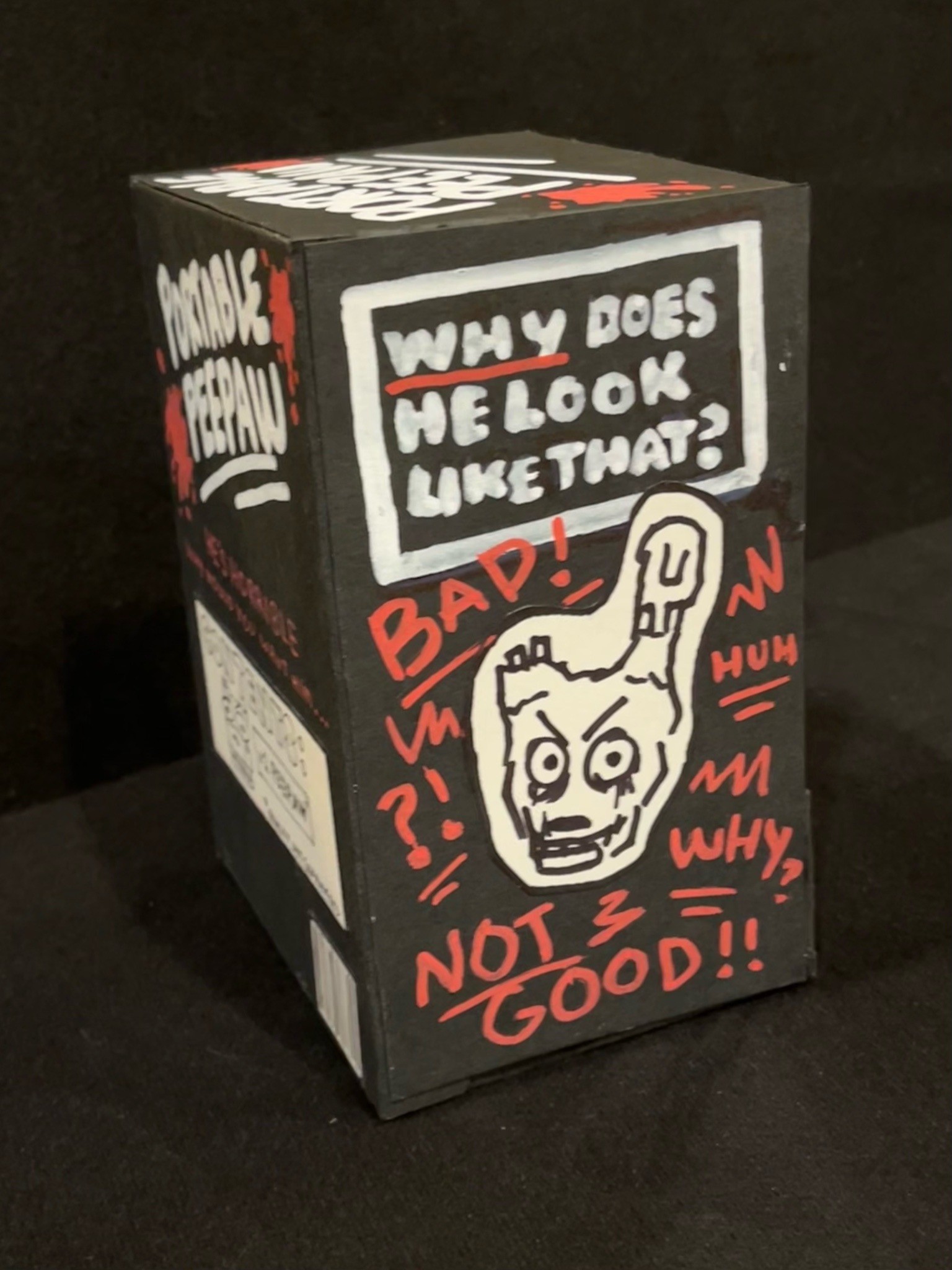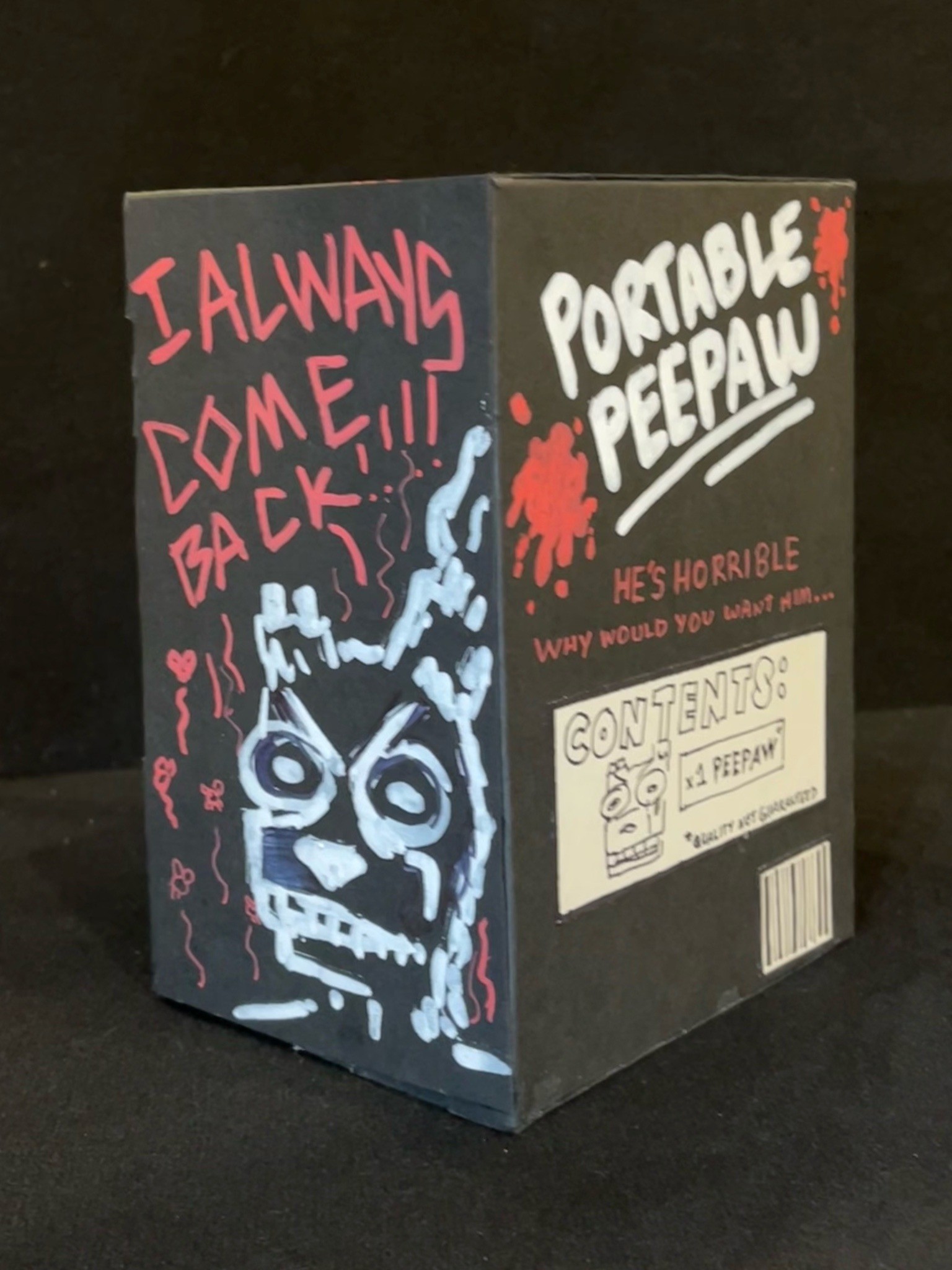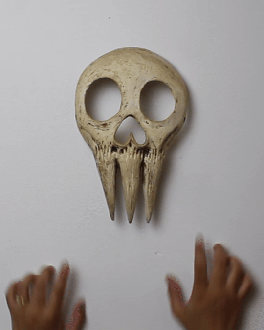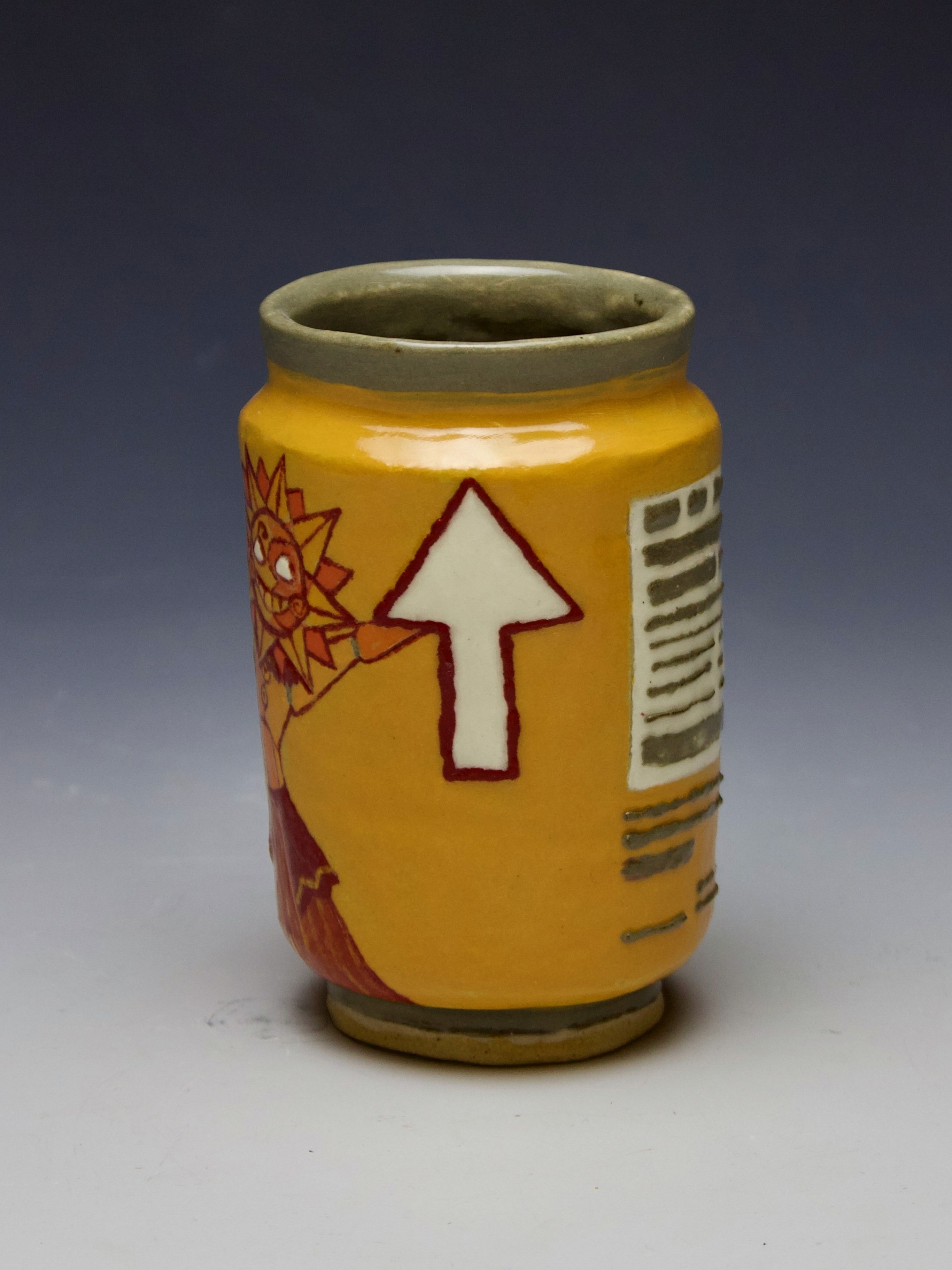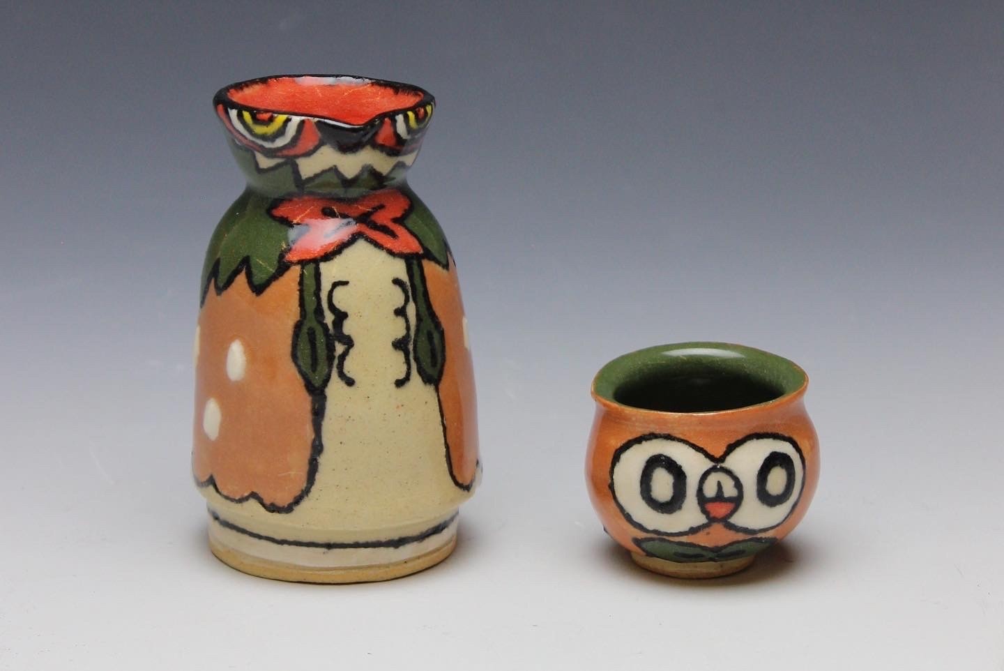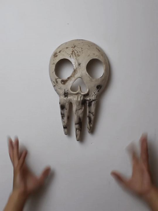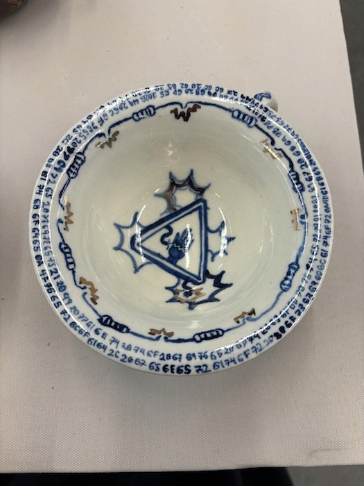 Hand-built porcelain with slip, overglaze, and glaze accents. Epoxy, paint and lacquer detailing added post fire. Iridescent Vinyl added post fire.