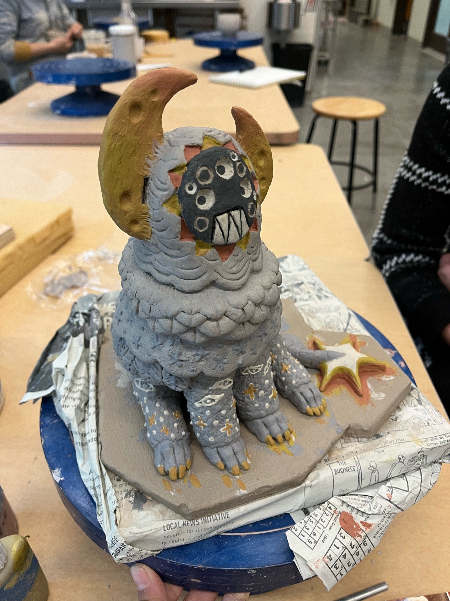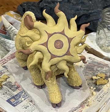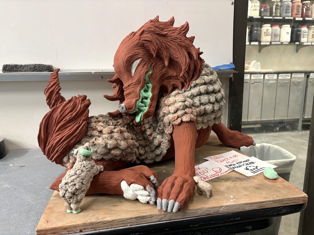 Hand-sculpted ceramics with underglaze and slip accents (as well as minor post-fire additions) on a “pasture” of wool.