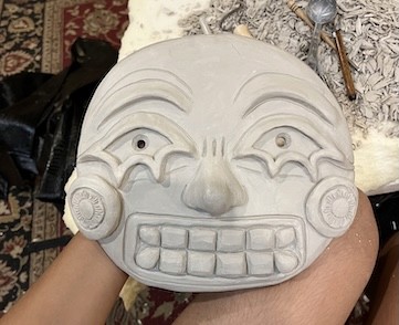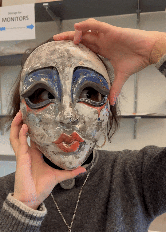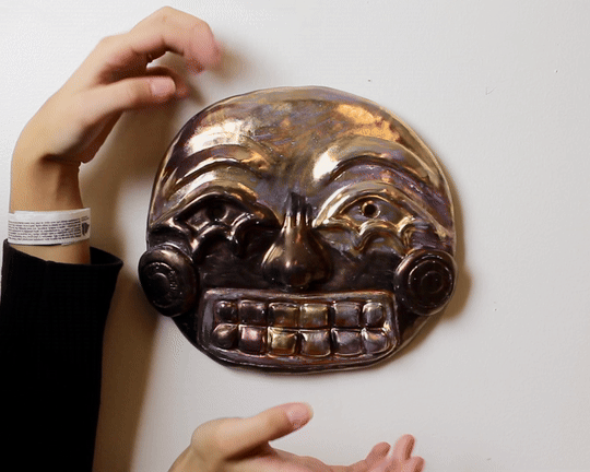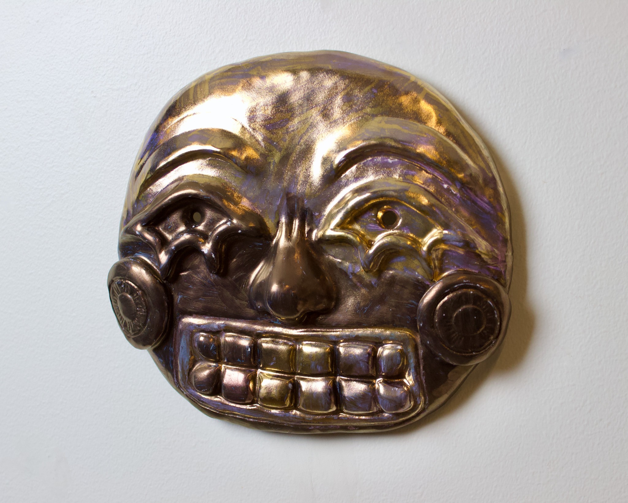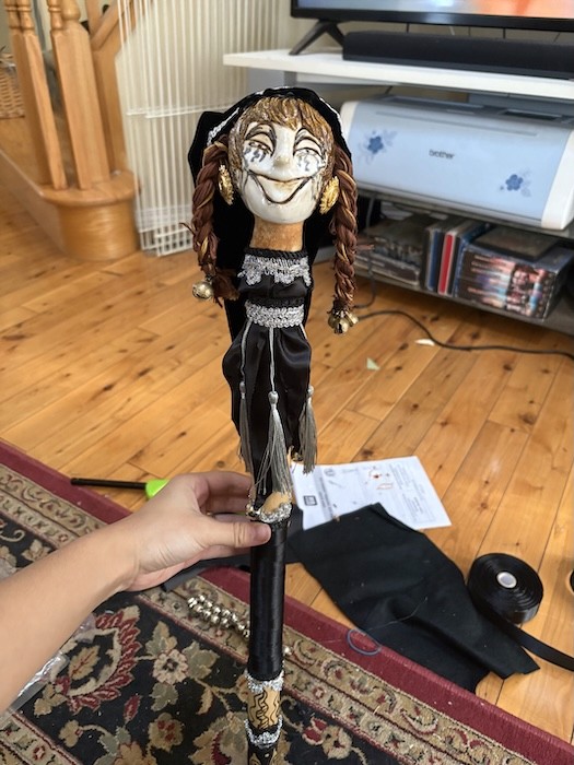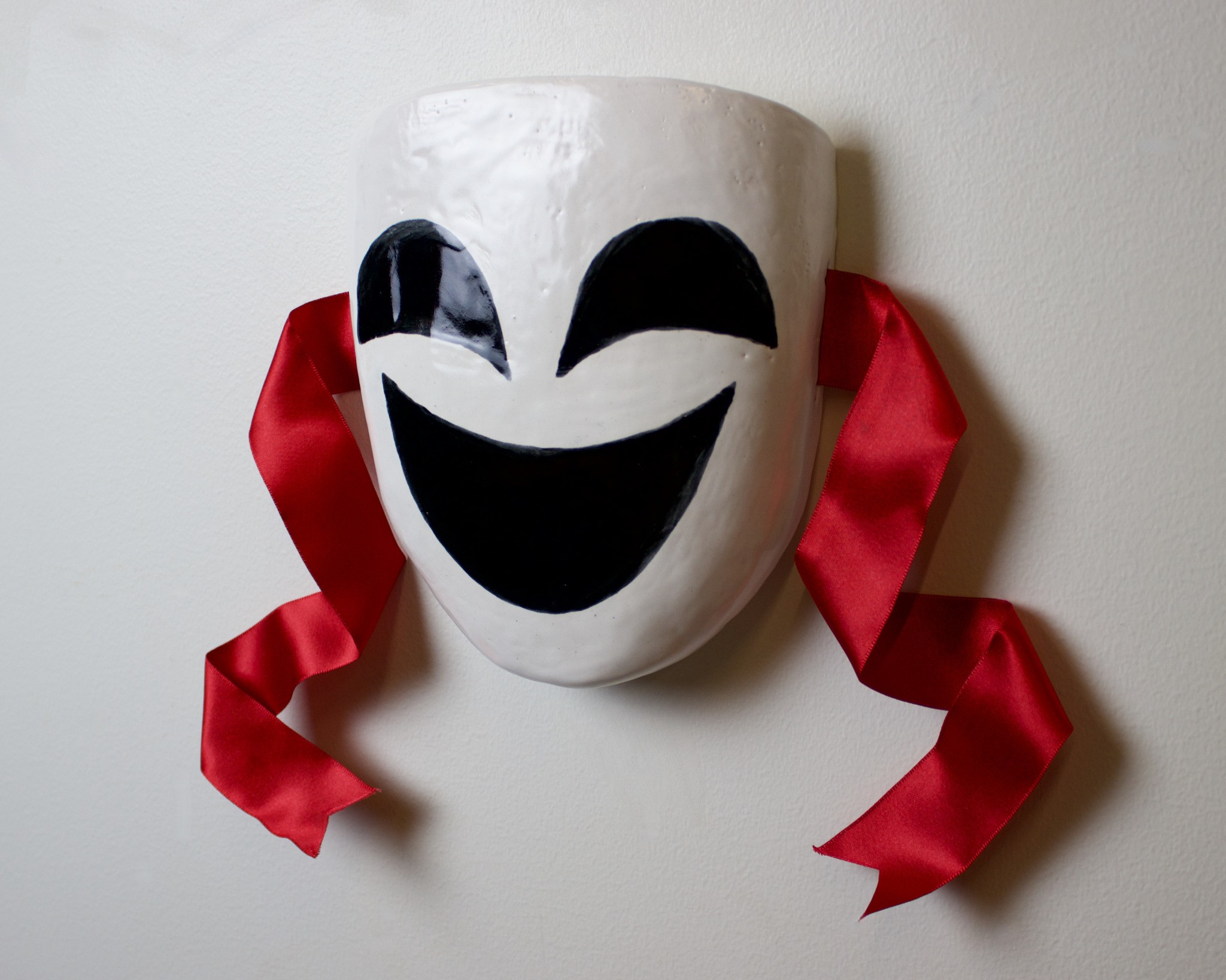 Hand-built porcelain with slip, overglaze, glaze, and gold lustre accents. Paint and lacquer detailing added post fire. Hand-sewn fool's cap and bells added post fire.
