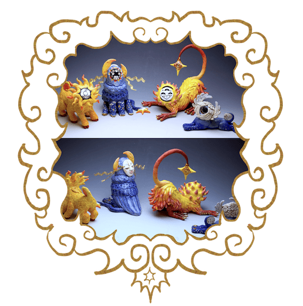 Hand-sculpted ceramics (Dawn and Sun being mason-stained porcelain + Dusk and Moon being earthenware) with underglaze, slip, and luster accents (as well as minor post-fire additions).