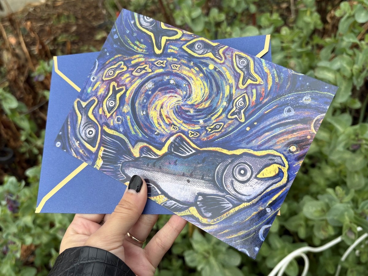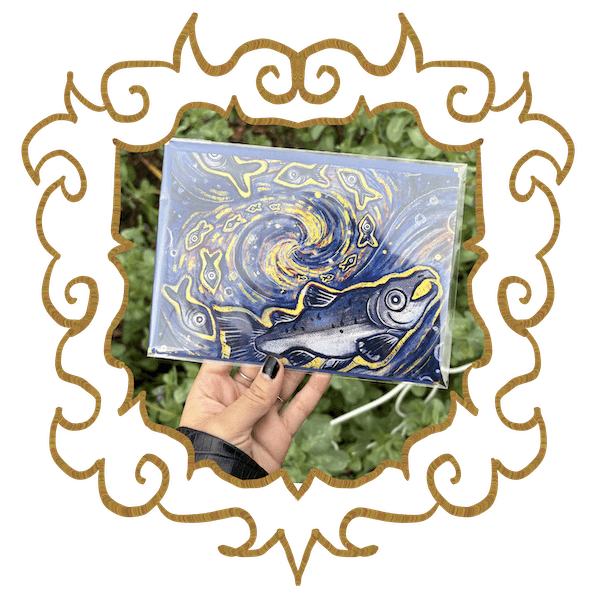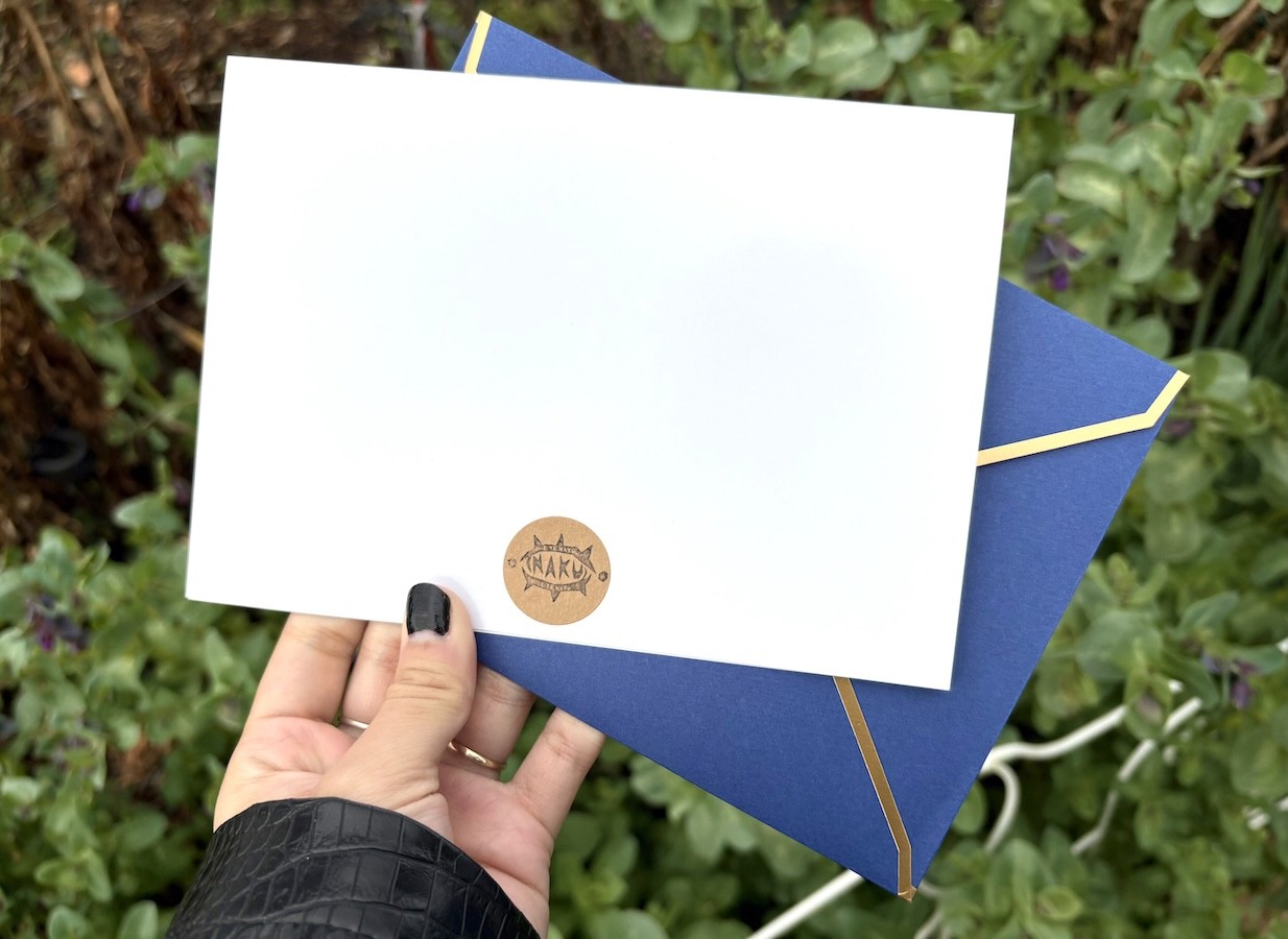 Greeting Cards featuring Original Artwork, printed on 110 lb. glossy uv-coated cardstock, paired with matching navy blue and gold envelopes.